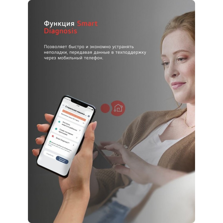 Электронное управление со смартфона позволяет управлять машиной из любой точки мира, а функция дозагрузки белья даёт возможность добавить забытые вещи, не прерывая цикл стирки. Прямой привод и инверторный двигатель обеспечивают тихую и эффективную работу.