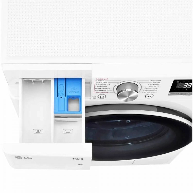 С помощью стиральной машины LG F2V7FS1W вы сможете выбрать скорость отжима и температуру стирки, воспользоваться функцией отложенного старта, очистить барабан и получить сигнал об окончании стирки.