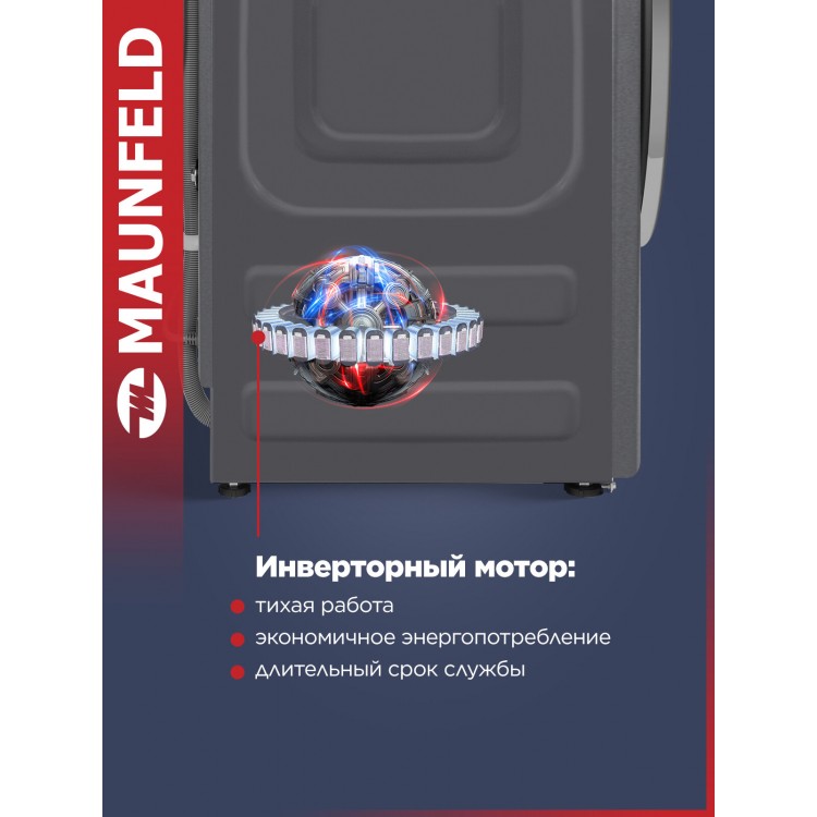 Стиральная машина Maunfeld MFWM127ISB02 оснащена инверторным двигателем, что обеспечивает её тихую работу (уровень шума при стирке — 62 дБ). Максимальная скорость отжима — 1200 об/мин, а расход воды за стирку составляет всего 50 л. Класс энергопотребления A+++ делает эту модель не только эффективной, но и экономичной.
