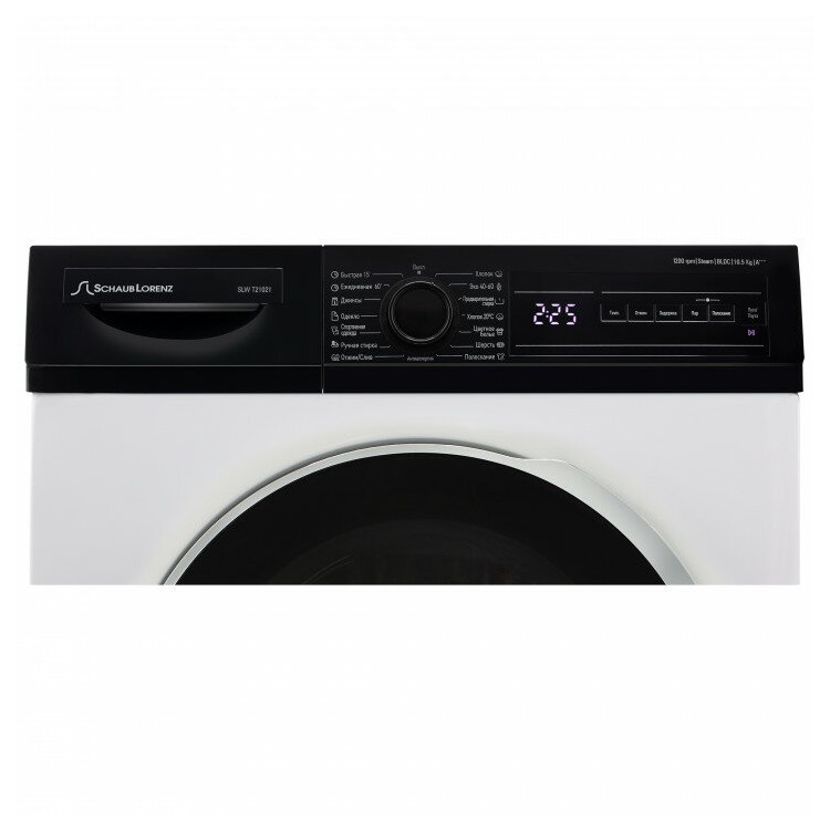 Название Стиральная машина Schaub Lorenz SLW T21021, с инверторным двигателем; Бренд Schaub Lorenz; Тип стиральная машина; Тип загрузки фронтальная; Загрузка белья 10.5 кг; Установка отдельно стоящая; Тип управления электронное; Инверторный двигатель да; Функция дозагрузки белья через основной люк; Высота 84.5 см; Глубина 58.2 см; Ширина 59.7 см; Вес 73.5 кг; Программы быстрая стирка, дополнительное полоскание, предварительная стирка, ручная стирка, стирка джинсов, стирка спортивной одежды, стирка хлопка, стирка цветных вещей, стирка шерсти, экономичная программа; Дополнительные функции выбор скорости отжима, контроль баланса, контроль за уровнем пены, отложенный старт; Подача пара да; Максимальное время отсрочки старта 23 ч; Расход воды за стирку 37 л; Количество программ стирки 15; Максимальная скорость отжима 1200 об/мин; Уровень шума при отжиме 74 дБ; Класс энергопотребления A+++; Класс стирки A; Класс отжима B; Защита от детей, от протечек; Тип защиты от протечек корпус; Материал бака металлопластик; Диаметр загрузочного люка 33 см; Гарантийный срок 3 лет; Цвет белый/черный люк;