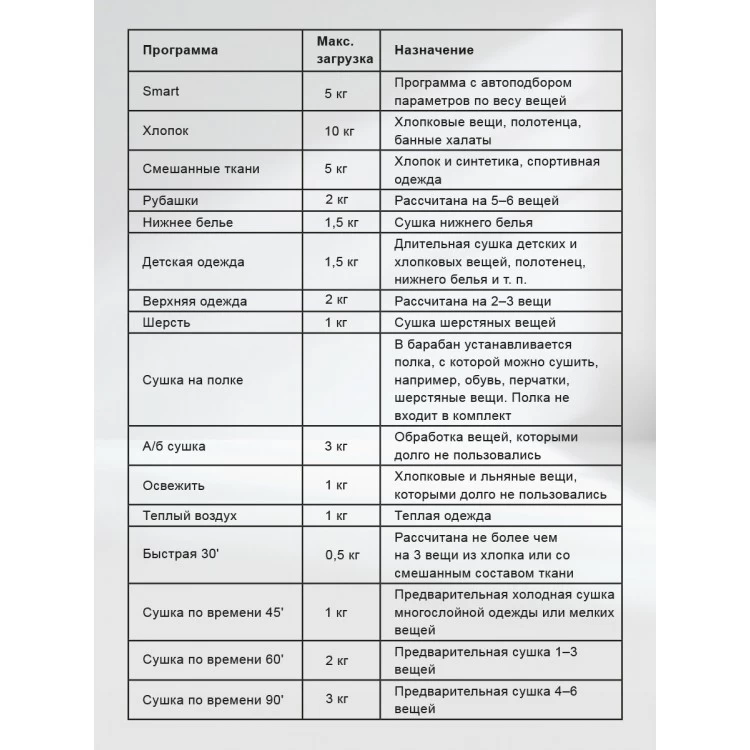 | Режимы | быстрая сушка, верхняя одежда, детская одежда, нижнее бельё, сорочки (рубашки), хлопок, шерсть |