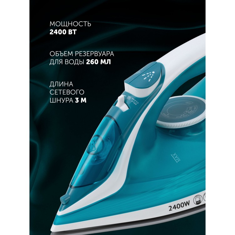 Мощность 2400 Вт гарантирует быстрый нагрев и эффективное разглаживание складок.