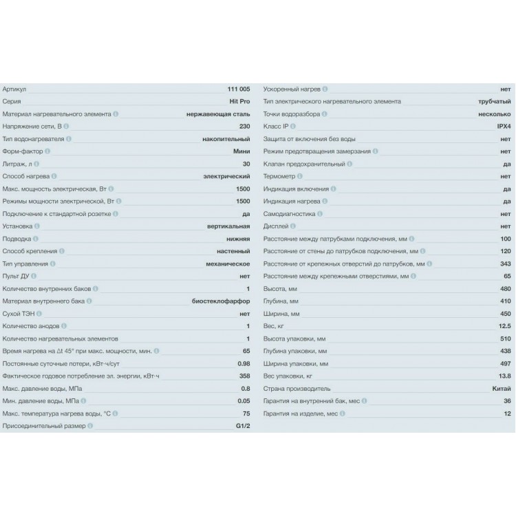 Накопительный водонагреватель Thermex Hit 30O (Pro) — отличное решение для обеспечения горячей водой одной или двух точек водоразбора. Его объем составляет 30 литров, чего достаточно для использования в условиях небольшой квартиры или загородного дома.