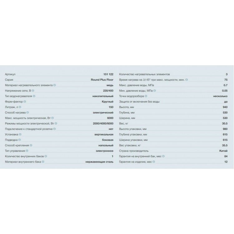 | Особенности | Нержавеющий внутренний бак G.5, ТЭН TitaniumHeat на основе титана, быстрый нагрев, выносной электронный пульт управления, высокоплотная теплоизоляция Super Foam, металлический корпус |