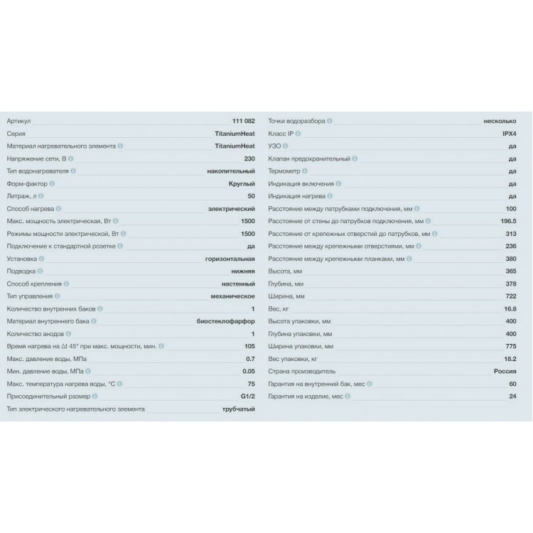* Дополнительные функции: термометр, термометр, УЗО, защита от перегрева, обратный клапан, предохранительный клапан и анод обеспечивают безопасность и долговечность работы.