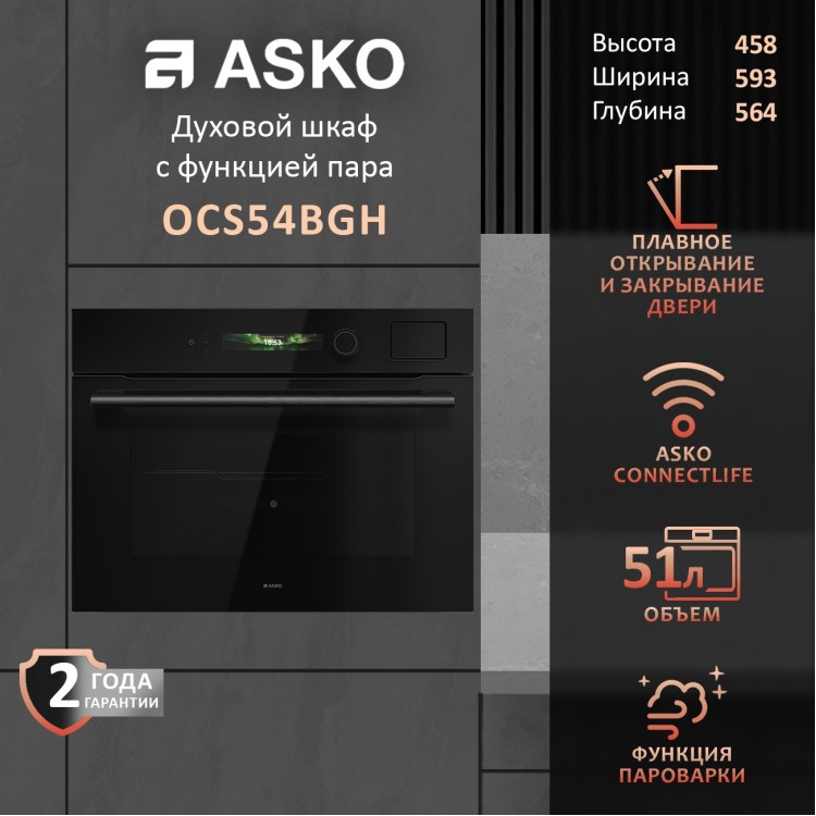 | Название | Духовой шкаф с функцией пара Asko OCS54BGH, черное стекло, 51л |
