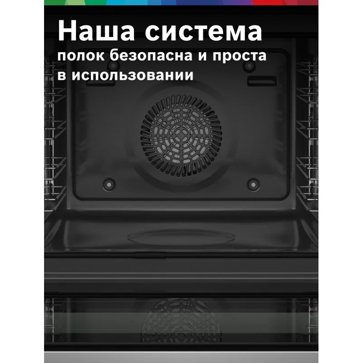 Многофункциональный духовой шкаф оснащён дисплеем, часами, подсветкой, а также вентилятором охлаждения, термощупом и полностью стеклянной внутренней поверхностью дверцы.