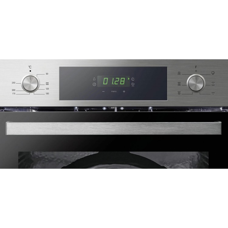 Максимальная температура достигает 250 °C, а среди режимов работы есть верхний и нижний нагрев, гриль и конвекция. Это даёт возможность готовить разнообразные блюда: от повседневных до праздничных. Поворотные механические переключатели и дисплей облегчают управление.