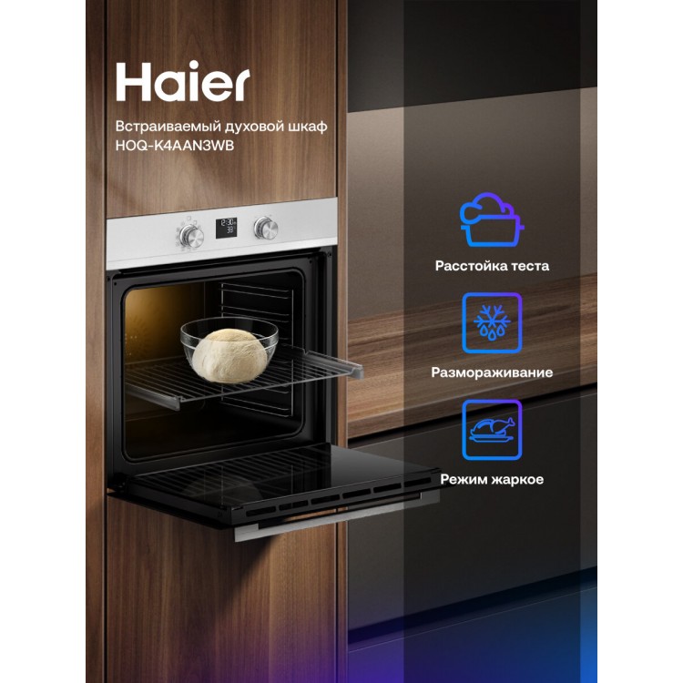 Название Духовой шкаф К4" HOQ-K4AAN3WB, электрический, 15 функций, белый; Размеры 59.5x56.5x59.5 см; Бренд Haier; Цвет товара Белый/серебристый; Тип духового шкафа Электрический; Установка Независимая; Объем духовки 72 л; Класс энергопотребления A+; Размеры (ШxГxВ) 59.5x56.5x59.5 см; Максимальная температура 250 °C; Режимы Верхний нагрев + нижний нагрев, Гриль + вентилятор; Гриль Да; Тип гриля Электрический; Конвекция Да; Переключатели Сенсорные; Утапливаемые переключатели Да; Сенсорный дисплей Да; Особенности конструкции Дисплей, телескопические направляющие; Дополнительные функции Вентилятор охлаждения, Дисплей; Дверца духовки Откидная; Очистка духовки Каталитическая; Количество стекол дверцы духовки Три; Безопасность Система защиты от детей; Подробная комплектация Решетка - 1 шт, противень - 2 шт; Гарантийный срок 5 лет; Вес, кг 38; Внутреннее покрытие Эмаль; Индикация Режим работы; Количество режимов работы 15; Потребляемая мощность, Вт 3480; Размер ниши, мм 56x58x60; Размеры, мм 595x565x595; Таймер Звуковой; Телескопические направляющие духовки Да; Тип управления Электронное; Управление духовкой Дисплей, Таймер, Утапливаемые переключатели; Функционал духовки Гриль, Конвекция; Цвет белый;