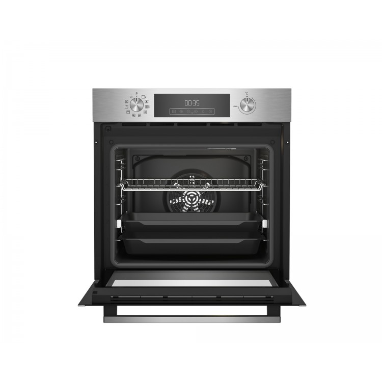 Поворотные утапливаемые переключатели обеспечивают удобство использования, а наличие дисплея и телескопических направляющих добавляет комфорта при эксплуатации. В комплекте с духовкой вы получите металлическую решётку, глубокий и плоский противни.