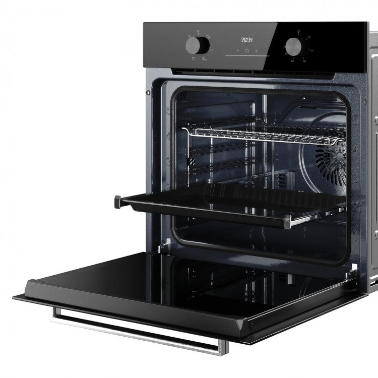 Управление духовым шкафом осуществляется с помощью поворотных механических переключателей. Гидролизная очистка духовки упрощает уход за ней. Два стекла в дверце обеспечивают безопасность и сохранение тепла. Система защиты от детей предотвращает случайное изменение настроек.