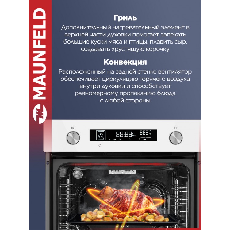 В духовом шкафу MAUNFELD AEOH60106W есть режимы «Гриль» и «Конвекция», которые помогут вам приготовить любимые блюда с хрустящей корочкой и равномерным пропеканием. Гриль оснащён электрическим нагревом, а конвекция обеспечивает циркуляцию горячего воздуха по всей камере.