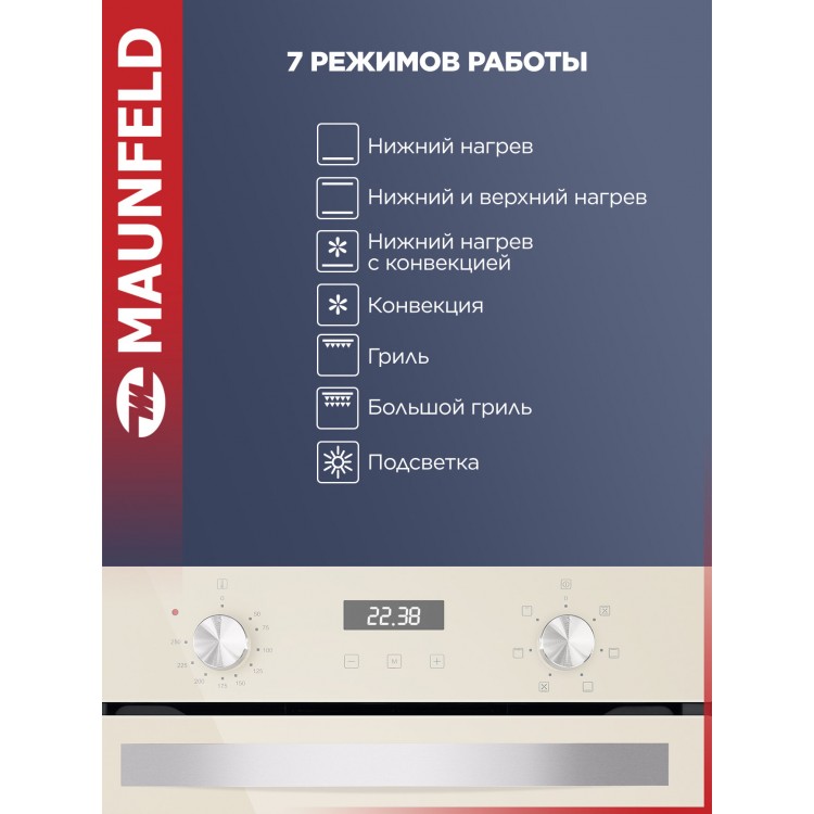 | Название | Духовой шкаф электрический встраиваемый MAUNFELD EOEM516BG, конвекция, гриль, 7 режимов, 51 литр, 45 см, бежевый |