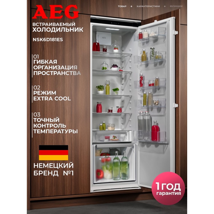 | Название | Встраиваемый холодильник AEG NSK6D181ES, электронное управление, зона свежести, объем 310 л. |