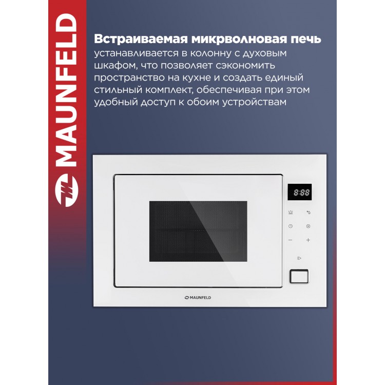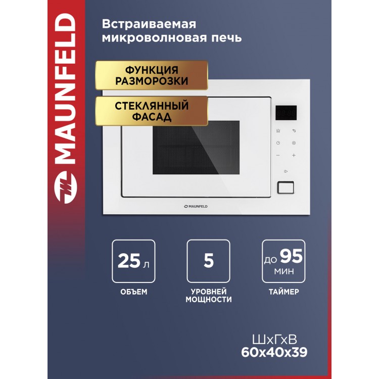 | Название | Микроволновка MAUNFELD MBMO925SGW11, встраиваемая, с режимом разморозки, белая, 25 литров |
