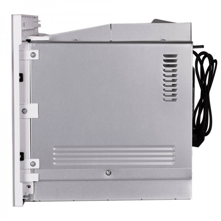 Печь выполнена в белом цвете и имеет внутреннее покрытие из нержавеющей стали, что обеспечивает лёгкость в уходе и долговечность. Сенсорные переключатели, дисплей, подсветка камеры, поворотный стол, таймер и часы делают использование печи максимально комфортным.