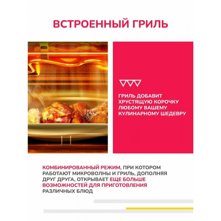 Внутреннее покрытие камеры из нержавеющей стали отличается прочностью и лёгкостью в очистке. Механические переключатели обеспечивают простоту и надёжность управления. Гриль мощностью 800 Вт и микроволны мощностью 700 Вт позволяют готовить разнообразные блюда с хрустящей корочкой.