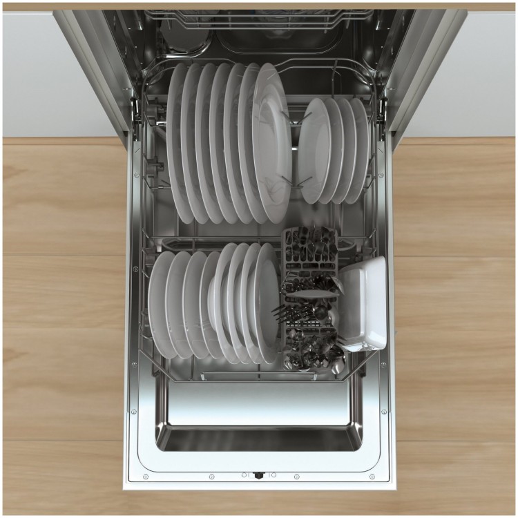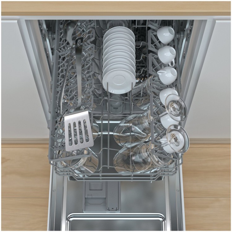 - Компактность и вместительность. Эта узкая посудомоечная машина вмещает до 10 комплектов посуды и идеально впишется в вашу кухню.
