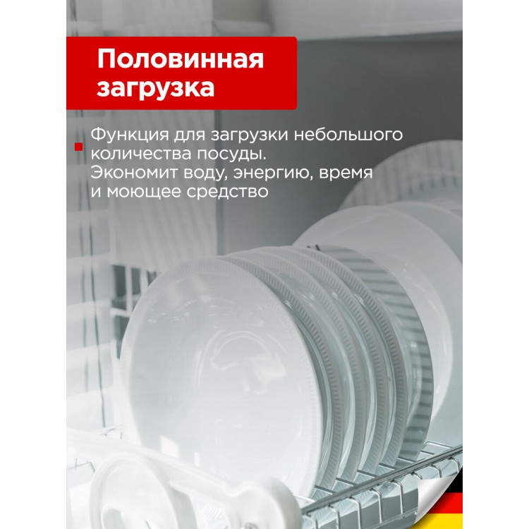 * Большая вместимость: машина вмещает до 14 комплектов посуды, что делает её идеальным решением для больших семей.