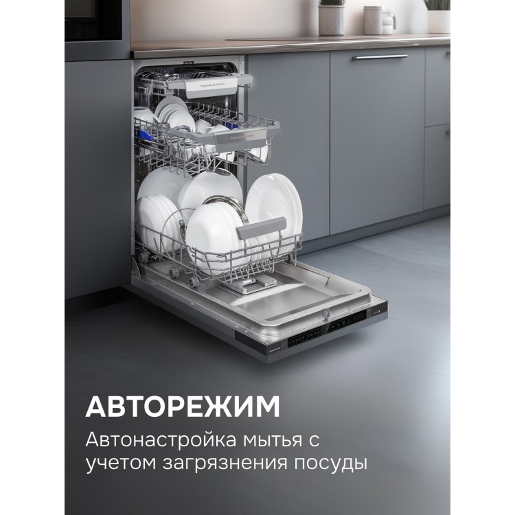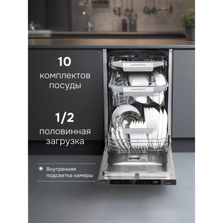 Среди особенностей модели — дисплей, возможность использования средств 3 в 1 и подсветка камеры. В комплекте идёт корзина для столовых приборов.