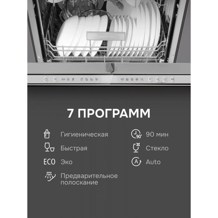 Электронное управление и 7 программ мойки, включая автоматическую, быструю, гигиеническую и режим половинной загрузки, делают эту модель удобной в использовании. Конденсационный тип сушки обеспечивает качественное высыхание посуды.