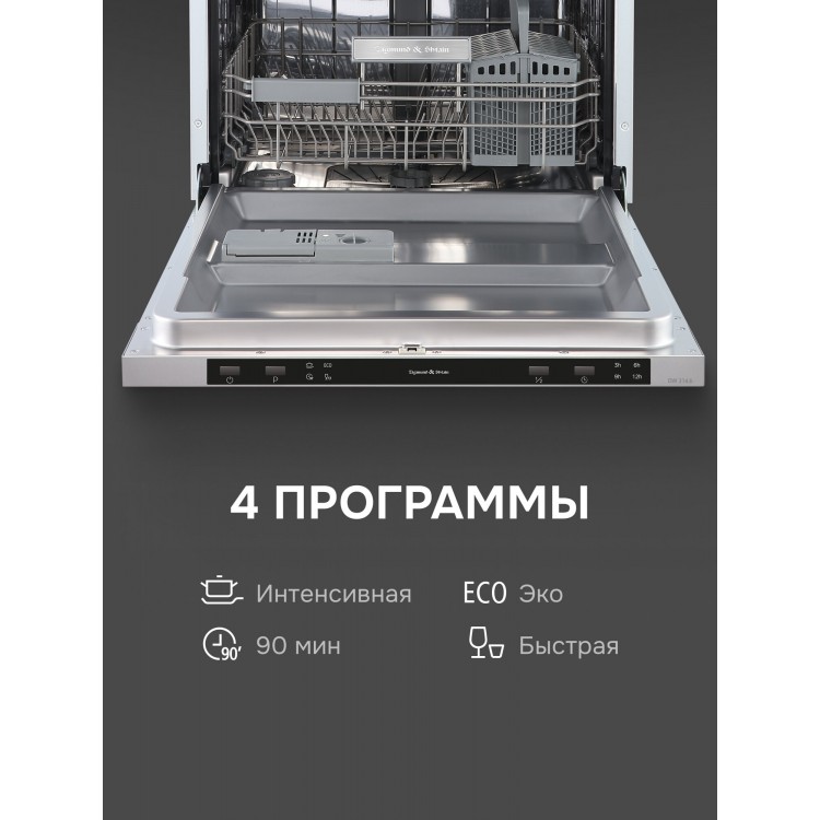 Благодаря электронному управлению и четырём программам мойки, включая быструю, интенсивную, режим на 90 минут и eco, вы сможете подобрать оптимальный режим для любых загрязнений. Класс сушки A гарантирует, что ваша посуда будет сухой после каждого цикла.