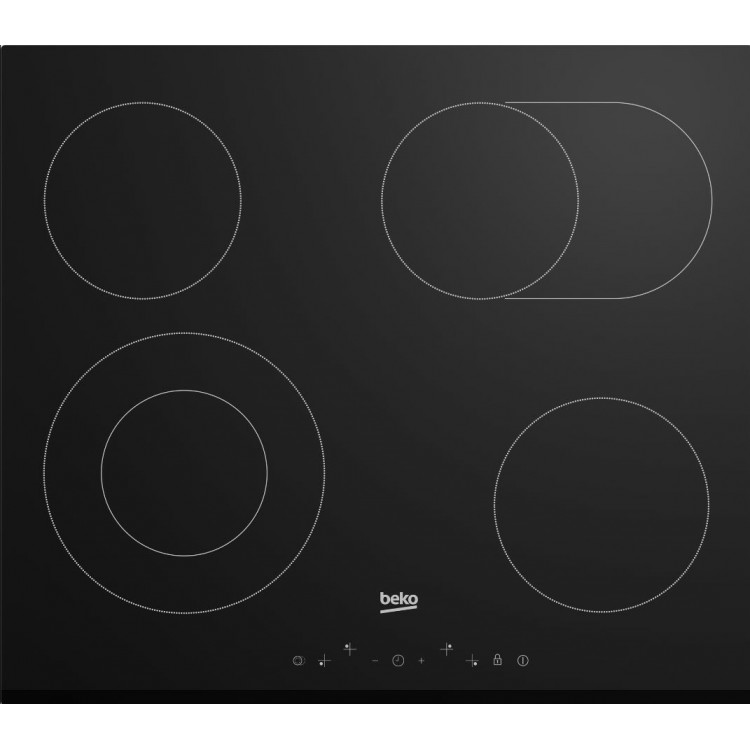У варочной панели Beko BHC6440KBEB четыре конфорки типа Hi Light, включая одну с овальной зоной нагрева. Сенсорные переключатели расположены спереди, что обеспечивает удобство использования. Защитное отключение конфорок, индикатор остаточного тепла и кнопка блокировки панели гарантируют безопасность при эксплуатации.