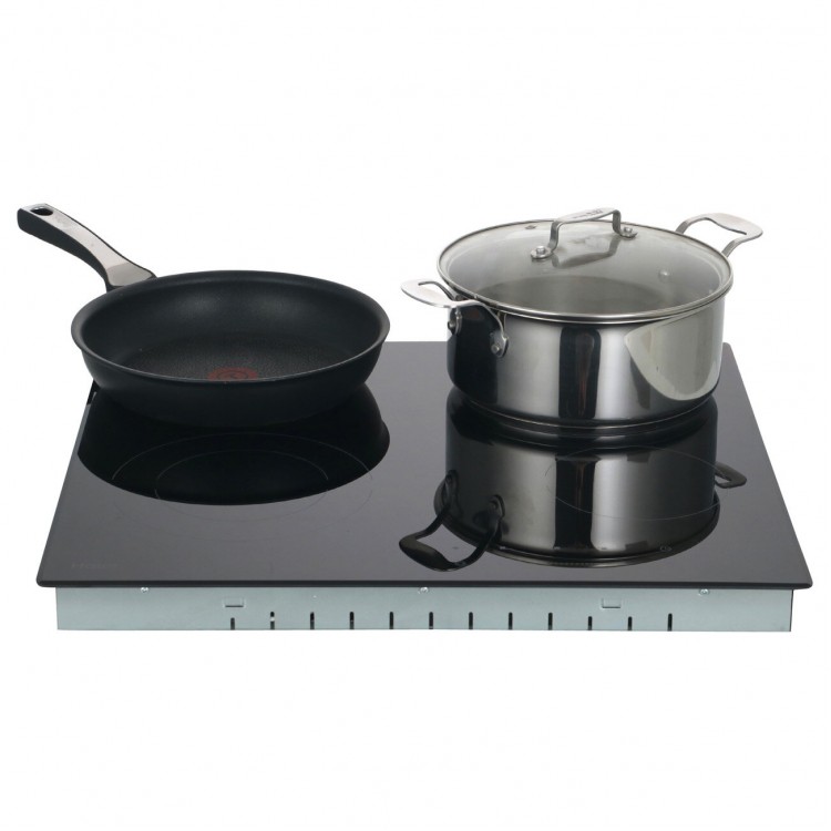 Модель оснащена четырьмя конфорками, включая двухконтурные конфорки, которые обеспечивают равномерное распределение тепла и позволяют готовить на больших кастрюлях и сковородах. Управление осуществляется с помощью сенсорных переключателей, что делает панель удобной и интуитивно понятной в использовании.