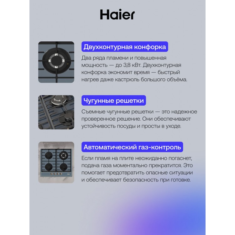 Газовая варочная панель Haier HHX-M64ATQBB – это идеальный выбор для тех, кто ценит надёжность, функциональность и удобство в использовании. Сделайте правильный выбор и наслаждайтесь готовкой с комфортом и уверенностью в безопасности!