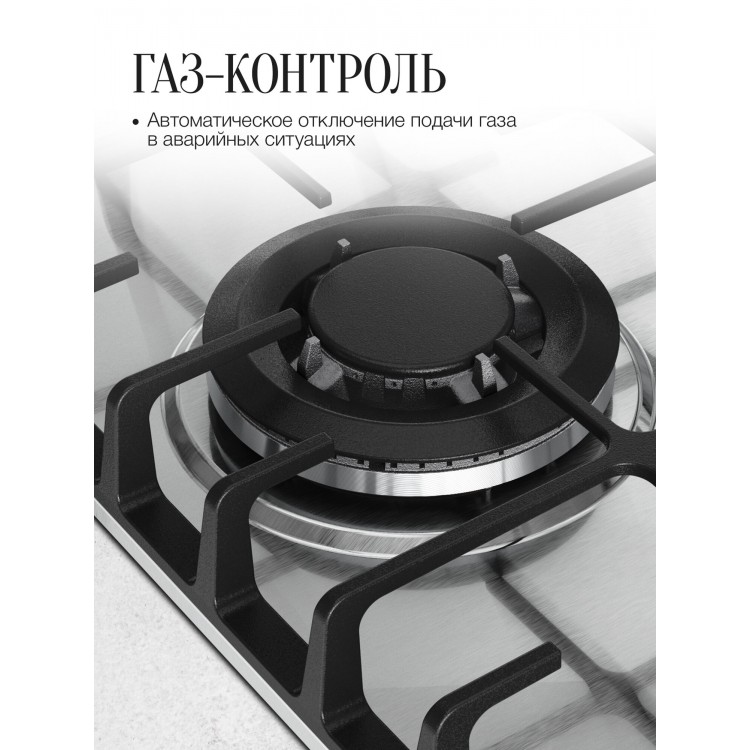 Автоматический электроподжиг упрощает процесс использования варочной панели, а чугунные решётки обеспечивают надёжную поддержку посуды.
