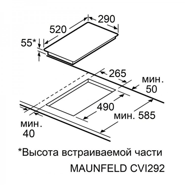 Название Индукционная варочная панель MAUNFELD CVI292S2FMBL LUX; Размеры 29x52 см; Бренд MAUNFELD; Цвет товара Голубой; Дизайн ДОМИНО Да; Материал рабочей поверхности Стеклокерамика; Рамка Нет; Установка Независимая; Тип варочной поверхности Индукционная; Ширина 29 см; Высота 6 см; Глубина 52 см; Ширина для встраивания 26.5 см; Глубина для встраивания 49 см; Максимальная потребляемая мощность 3.5 кВт; Количество конфорок 2; Конфорок газовых 3; Специальные конфорки Двойная корона, индукционная, экспресс-конфорка; Конфорок индукционных 2; Экспресс-конфорок 1; Конфорок Двойная корона 1; Минимальный диаметр конфорки 19 см; Максимальный диаметр конфорки 19 см; Размеры конфорок 2x190x190; Переключатели Сенсорные; Тип сенсорного управления Слайдерное; Расположение панели управления Спереди; Тип электроподжига Автоматический; Газ-контроль конфорок Да; Особенности Чугунные решетки; Функции Кратковременная пауза, поддержание тепла, распознавание наличия посуды, распознавание размера посуды, таймер, функция Booster; Тип таймера С отключением; Безопасность Защитное отключение конфорок, индикатор остаточного тепла, кнопка блокировки панели; Габариты транспортной упаковки 38x58x12; Вес в килограммах с учетом упаковки 5.5; Цвет голубой;