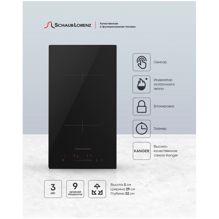 Название Электрическая варочная панель Schaub Lorenz SLK CY 30 S1; Бренд Schaub Lorenz; Цвет черный; Дизайн ДОМИНО да; Материал панели стеклокерамика; Установка независимая; Тип варочной поверхности электрическая; Ширина 29 см; Высота 5 см; Глубина 52 см; Ширина для встраивания 27 см; Глубина для встраивания 49 см; Максимальная потребляемая мощность 3.2 кВт; Общее количество конфорок 2; Конфорок электрических 2; Специальные конфорки индукционная, HiLight; Конфорок индукционных 2; Необычные конфорки HiLight; Минимальный диаметр конфорки 16.5 см; Максимальный диаметр конфорки 20 см; Размеры конфорок 1хØ165 мм 1200 Вт + 1хØ200 мм; 1800 Вт; Переключатели сенсорные; Тип сенсорного управления слайдерное; Расположение панели управления спереди; Электроподжиг нет; Особенности автоматическое отключение, Домино, края панели скошенные; Управление со смартфона нет; Функции таймер; Тип таймера звуковой с отключением; Безопасность защитное отключение конфорок, индикатор остаточного тепла, кнопка блокировки панели, Автоотключение, Блокировка кнопки включения; Возможность работы от газового баллона нет; Дополнительная информация Комплектация: уплотнительная лента для монтажа, крепления и болты для столешницы, кабель питания, инструкция, руководство по подключению, гарантийный талон; Габариты транспортной упаковки 38х58х12 см; Вес в транспортной упаковке 5.4 кг; Срок службы 5 лет; Гарантийный срок 1 г., Продавец обязуется предоставить гарантийное обслуживание в течение 1 года с момента покупки по чеку, гарантия распространяется только на заводские дефекты; Цвет черный;