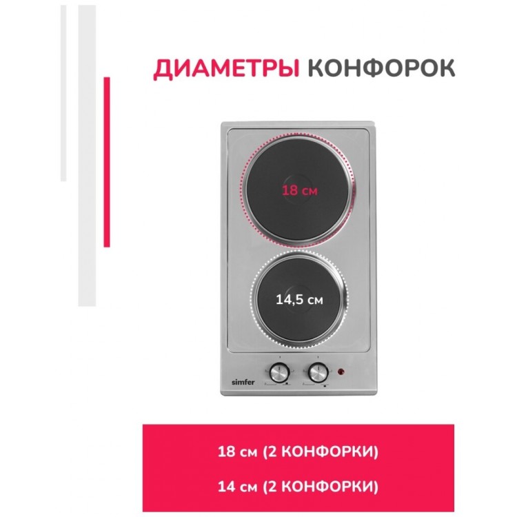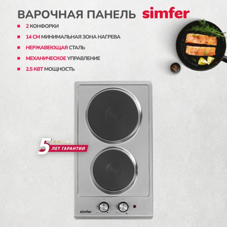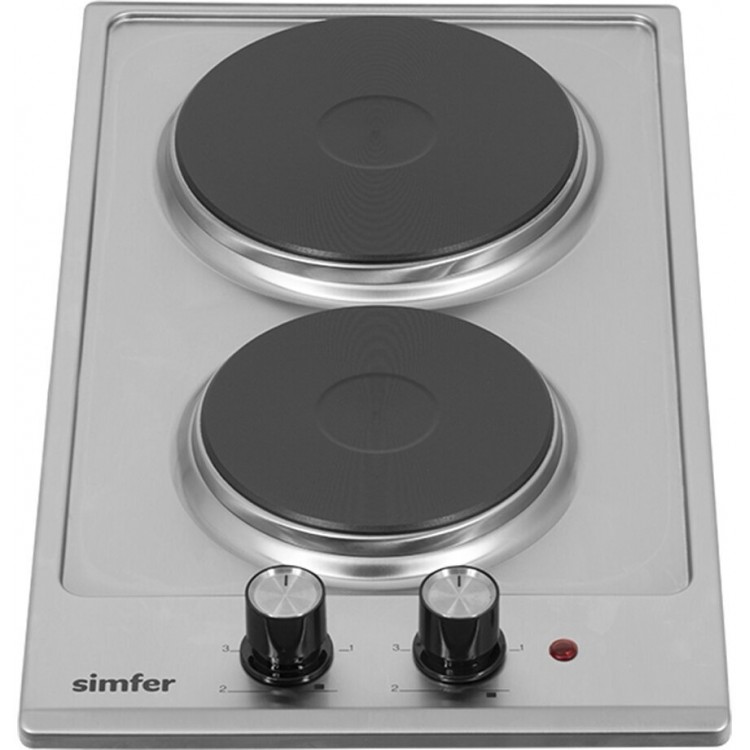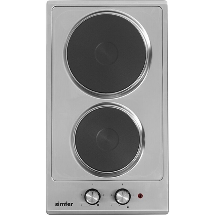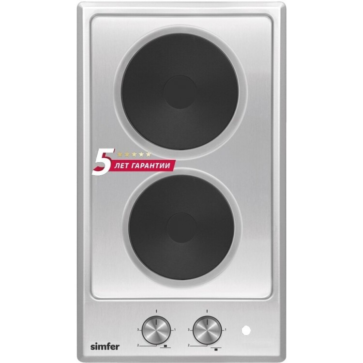Название Электрическая варочная панель Simfer H30E02M016; Бренд Simfer; Цвет серебристый; Дизайн ДОМИНО да; Материал панели нержавеющая сталь; Установка независимая; Тип варочной поверхности электрическая; Ширина 30 см; Высота 5.5 см; Глубина 51 см; Ширина для встраивания 48 см; Глубина для встраивания 27 см; Максимальная потребляемая мощность 2.5 кВт; Общее количество конфорок 2; Конфорок электрических 2; Специальные конфорки электроконфорка; Электроконфорок 2; Переключатели поворотные, спереди; Расположение панели управления спереди; Электроподжиг нет; Тип электроподжига автоматический; Тип таймера Нет; Безопасность защитное отключение конфорок; Дополнительная информация мощность конфорок: 1х1500 Вт, 1х1000 Вт; Габариты транспортной упаковки 39.94х24.69х32.09 см; Вес в транспортной упаковке 5.38 кг; Срок службы 5 лет; Гарантийный срок 5 лет, Гарантия завода 2 года. Дополнительная гарантия представителя Simfer в России - 3 года; Цвет серебристый;