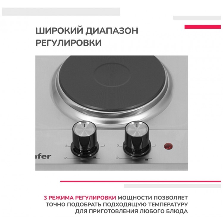 3. Две конфорки. Модель имеет две электрические конфорки, которые обеспечивают равномерный нагрев и быстрое приготовление пищи.