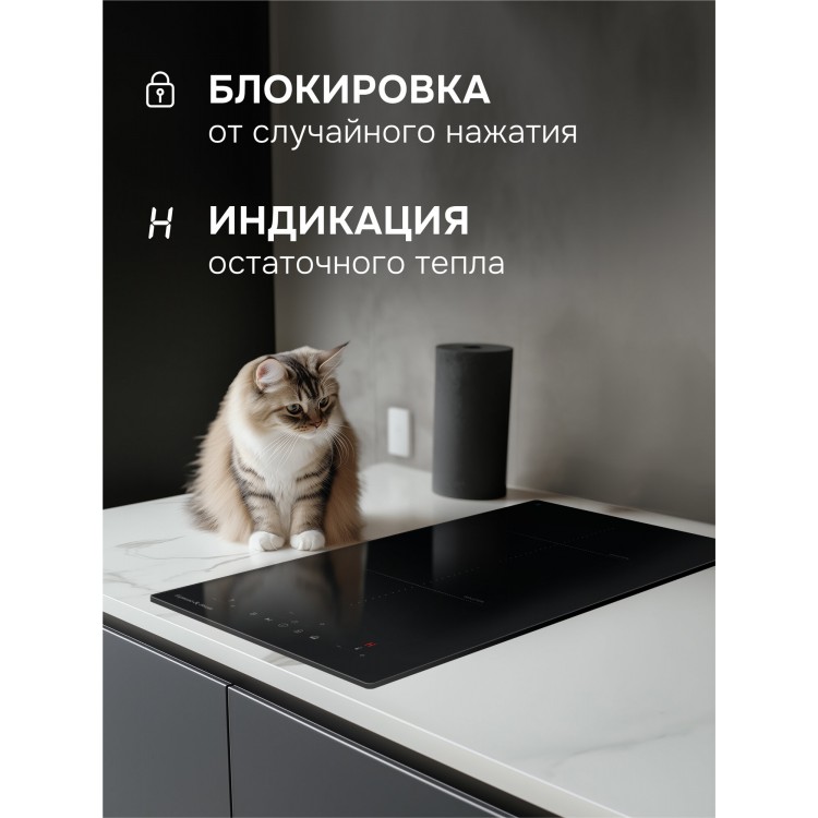 * Защитное отключение конфорок, индикатор остаточного тепла и кнопка блокировки панели обеспечивают безопасность использования.
