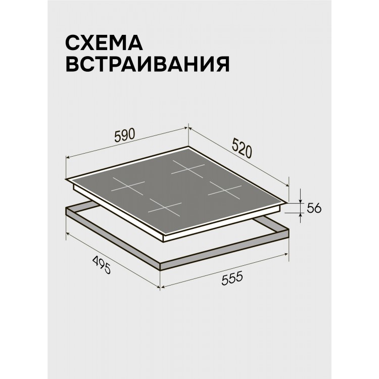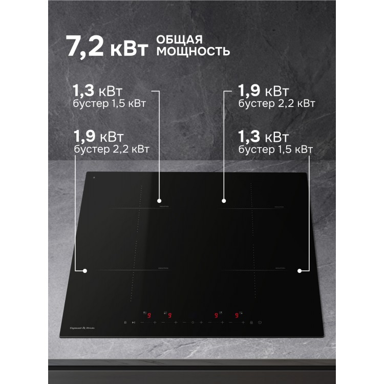 Название Варочная панель индукционная CI 22.6 B, стеклокерамика, 7200 Вт, черный; Размеры 60x52 см; Бренд Zigmund & Shtain; Цвет товара Черный; Линейка Primary; Материал рабочей поверхности Стеклокерамика; Установка Независимая; Тип варочной поверхности Индукционная; Ширина 60 см; Высота 5.6 см; Глубина 52 см; Ширина для встраивания 55.5 см; Глубина для встраивания 49.5 см; Максимальная потребляемая мощность 7.2 кВт; Количество конфорок 4; Специальные конфорки Индукционная; Конфорок индукционных 4; Минимальный диаметр конфорки 16 см; Максимальный диаметр конфорки 18 см; Переключатели Сенсорные; Тип сенсорного управления Кнопочное; Расположение панели управления Спереди; Функции Распознавание размера посуды, таймер, функция Booster; Тип таймера С отключением; Безопасность Защитное отключение конфорок, индикатор остаточного тепла, кнопка блокировки панели; Тип соединения устройств Проводное; Габариты транспортной упаковки 63.6x57x11.4; Вес в килограммах с учетом упаковки 9; Гарантийный срок 5 лет; Цвет черный;