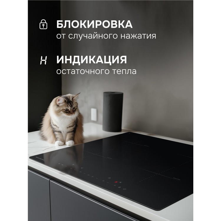 Безопасность | Защитное отключение конфорок, индикатор остаточного тепла, кнопка блокировки панели |