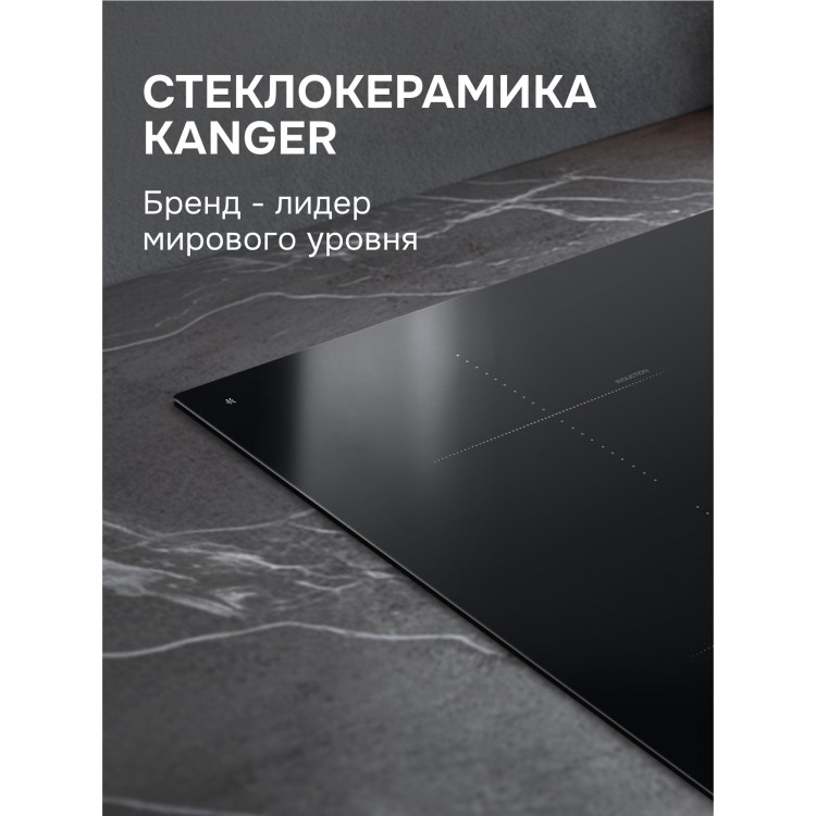 Рабочая поверхность изготовлена из стеклокерамики, что обеспечивает долговечность и лёгкость в уходе. Максимальная потребляемая мощность составляет 7,2 кВт, а количество конфорок — 4. Каждая из них индукционная, с минимальным диаметром 16 см и максимальным 18 см.