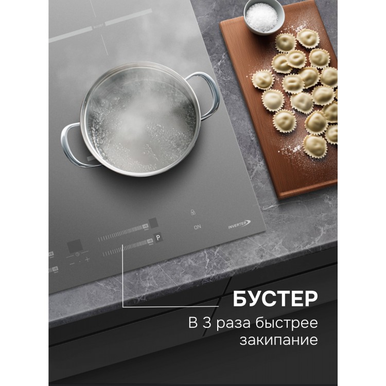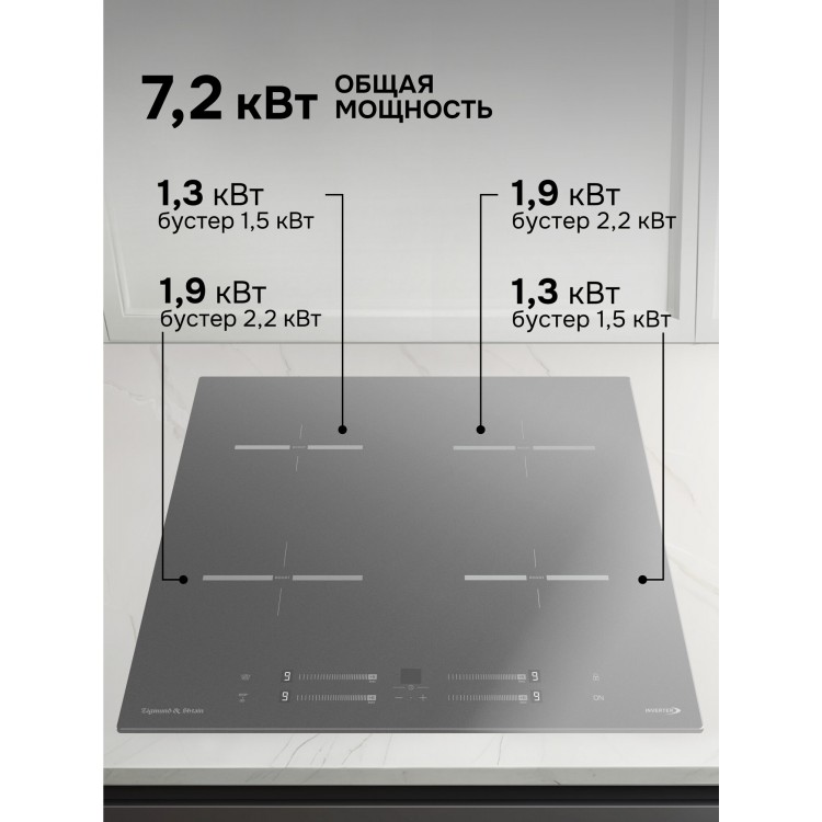 * Тип варочной поверхности: индукционная. Максимальная потребляемая мощность — 7,2 кВт.