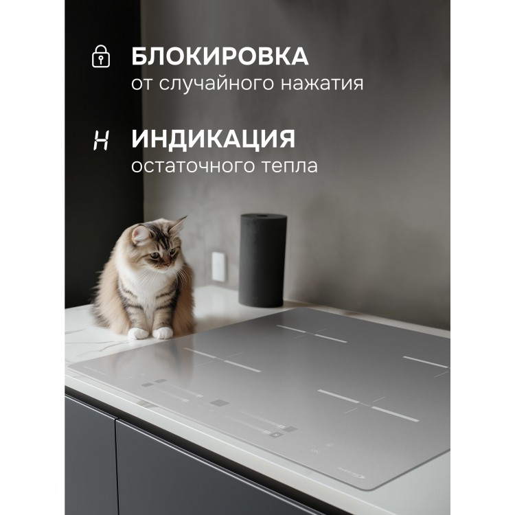 * Безопасность: индикатор остаточного тепла и кнопка блокировки панели.