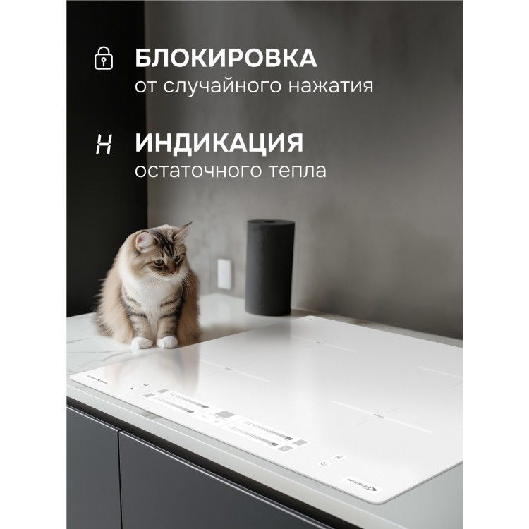 * Защитное отключение конфорок, индикатор остаточного тепла, кнопка блокировки панели. Безопасность использования на высшем уровне.