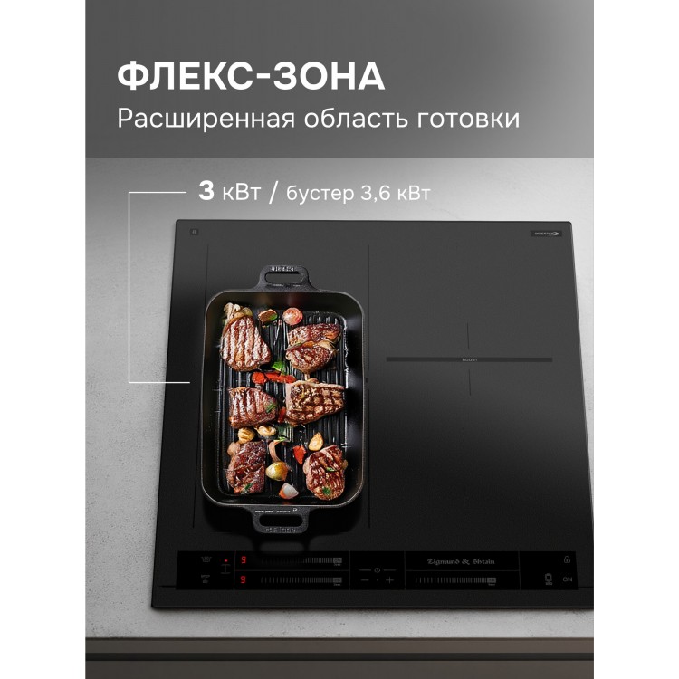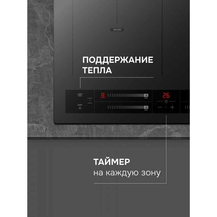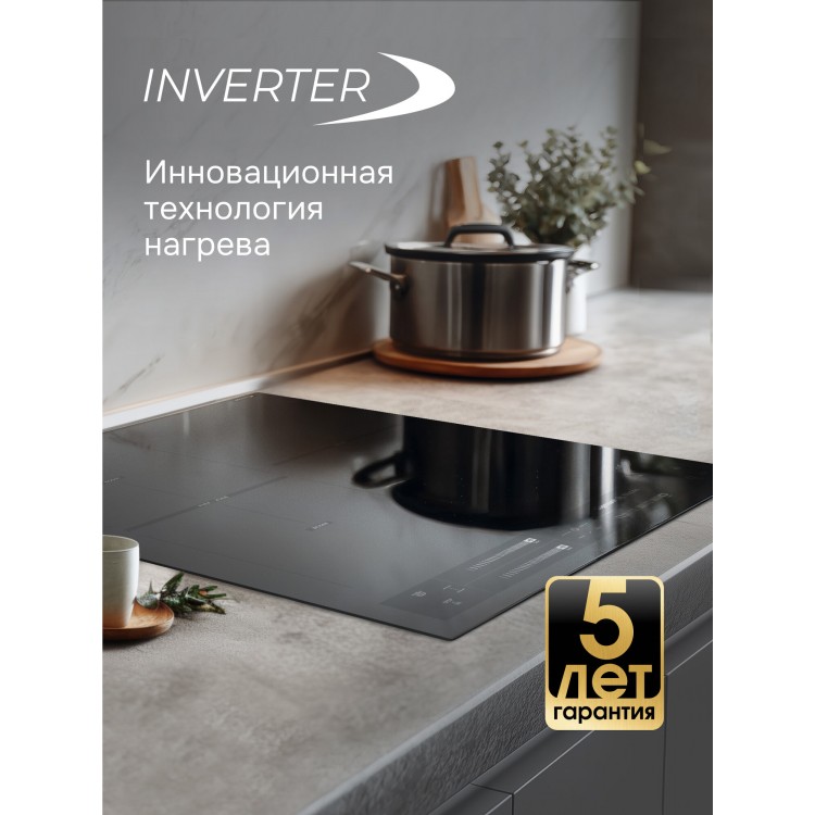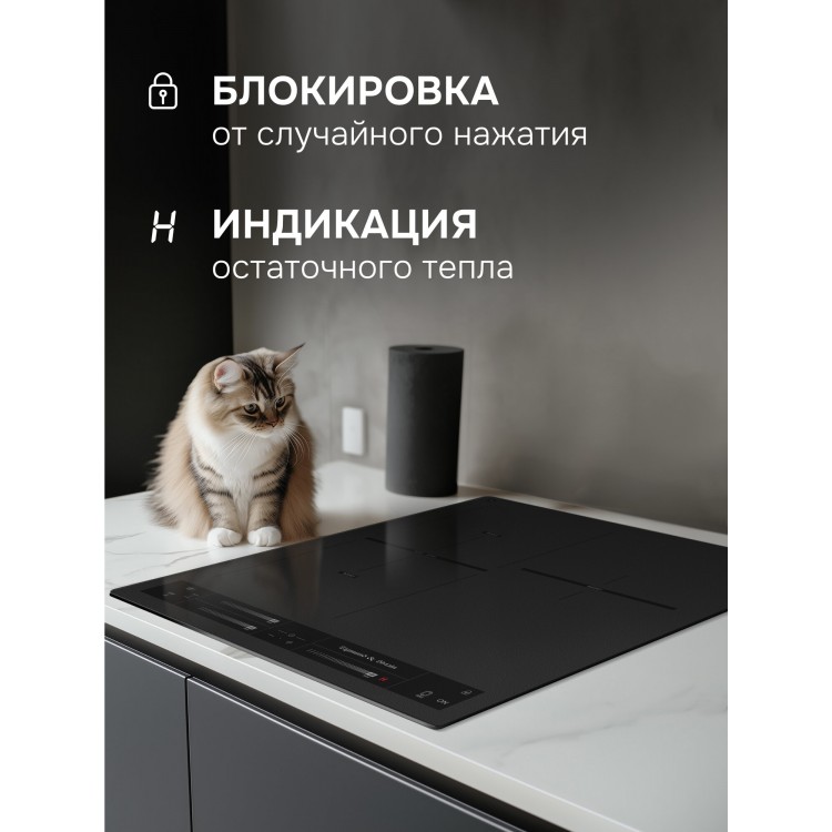 Среди функций модели — распознавание размера посуды, таймер и функция Booster. Для безопасности предусмотрены защитное отключение конфорок, индикатор остаточного тепла и кнопка блокировки панели.