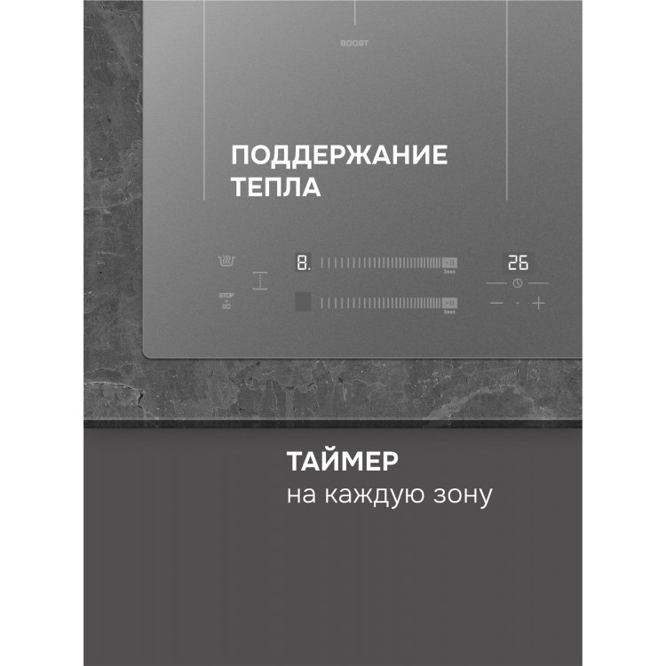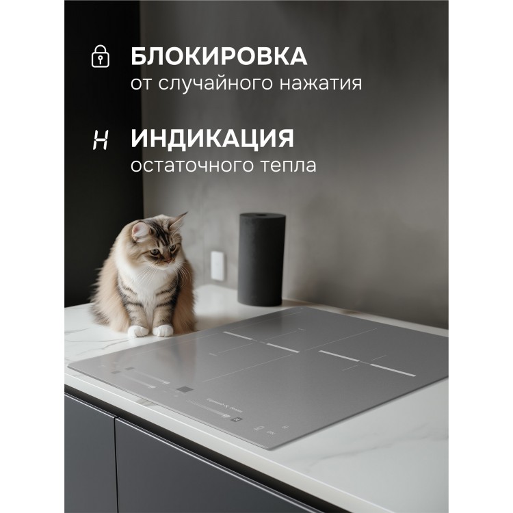 * Сенсорные переключатели с слайдерным управлением. Управление варочной панелью интуитивно понятно и удобно.