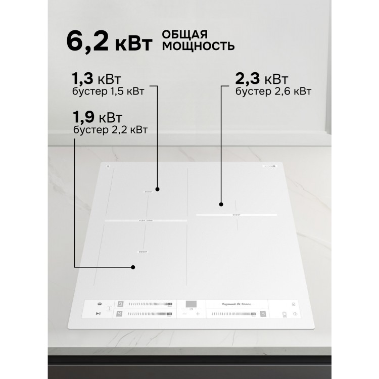 Название Индукционная варочная панель CI 24.4 W, 6200 Вт, белый; Размеры 45x52 см; Бренд Zigmund & Shtain; Цвет товара Белый; Линейка Slimline; Материал рабочей поверхности Стеклокерамика; Установка Независимая; Тип варочной поверхности Индукционная; Ширина 45 см; Высота 5.6 см; Глубина 52 см; Ширина для встраивания 43 см; Глубина для встраивания 49.5 см; Максимальная потребляемая мощность 6.2 кВт; Количество конфорок 3; Специальные конфорки Индукционная; Конфорок индукционных 3; Минимальный диаметр конфорки 18 см; Максимальный диаметр конфорки 18 см; Переключатели Сенсорные; Тип сенсорного управления Слайдерное; Расположение панели управления Спереди; Особенности Multi Slider; Функции Распознавание размера посуды, таймер, функция Booster, функция Flex Zone; Безопасность Защитное отключение конфорок, индикатор остаточного тепла, кнопка блокировки панели; Тип соединения устройств Проводное; Габариты транспортной упаковки 52x56x13; Вес в килограммах с учетом упаковки 6.8; Гарантийный срок 5 лет; Цвет белый;