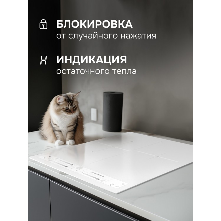 * Безопасность. Защитное отключение конфорок, индикатор остаточного тепла и кнопка блокировки панели обеспечивают безопасность использования.