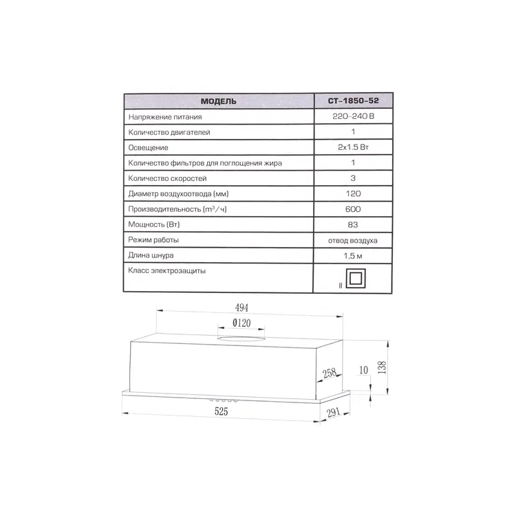 | Диаметр патрубка воздуховода | 120 мм |
