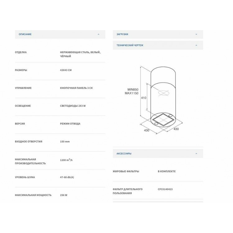 Мощность и производительность. Вытяжка оснащена одним двигателем и имеет три скорости, что позволяет эффективно очищать воздух в вашей кухне от запахов и испарений. Максимальная производительность составляет 1200 кубических метров в час, что обеспечивает быстрое и качественное удаление загрязнённого воздуха.