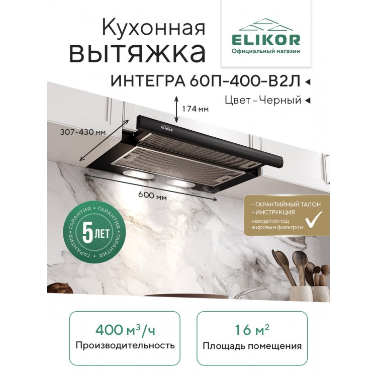Управление вытяжкой механическое, с помощью ползунковых переключателей. Для освещения используется галогенная лампа. Антивозвратный клапан в конструкции предотвращает обратный ток воздуха. Диаметр патрубка воздуховода составляет 120 мм.