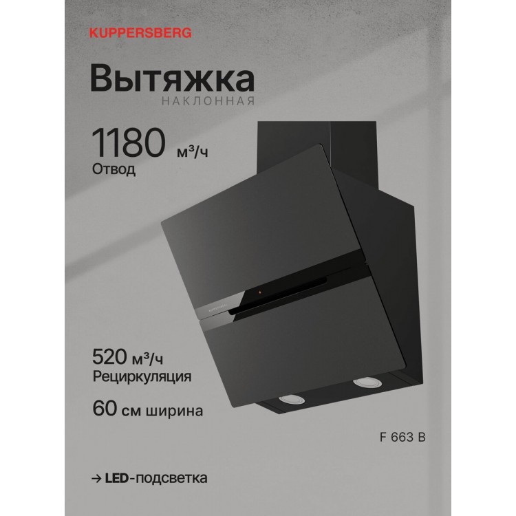 | Дополнительная информация | Вытяжка Kuppersberg F 663B, наклонная, сенсорное управление, периметрическая система |