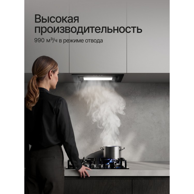 Благодаря высокой производительности (1200 м³/час) и трём скоростям работы вытяжка эффективно очищает воздух. Режимы работы — отвод или циркуляция — позволяют выбрать оптимальный вариант для вашей системы вентиляции.